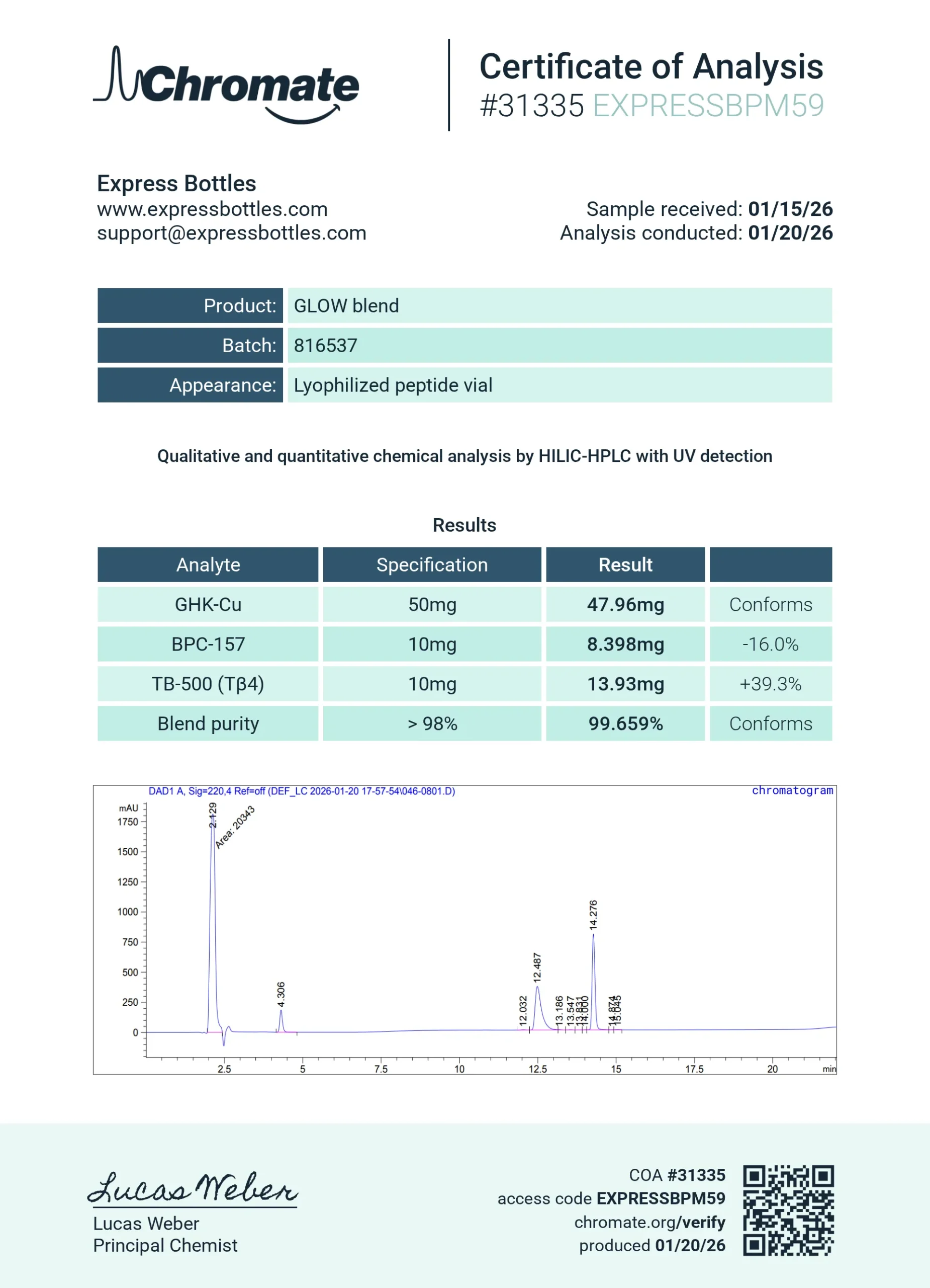 Our testing lab confirms peptides sequential signatures.